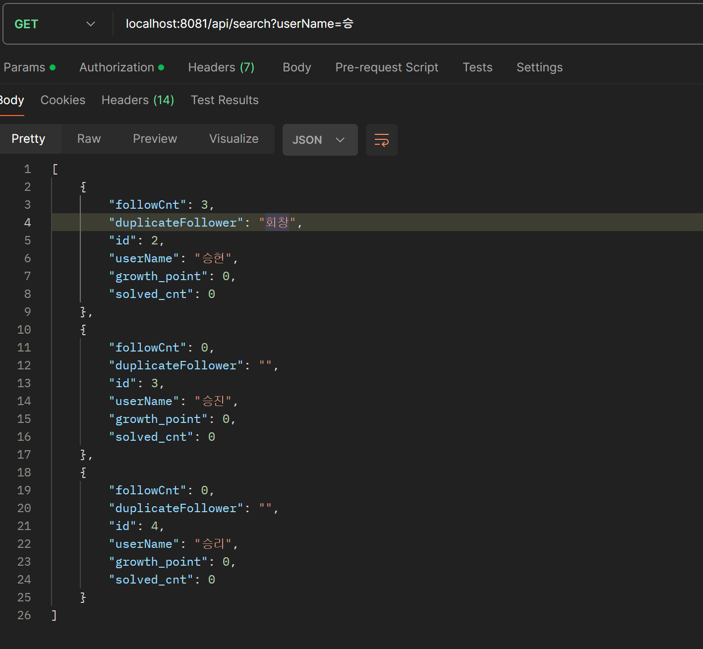 - 요청변수로 들어온 키워드값을 통해 유저 검색을 진행합니다.