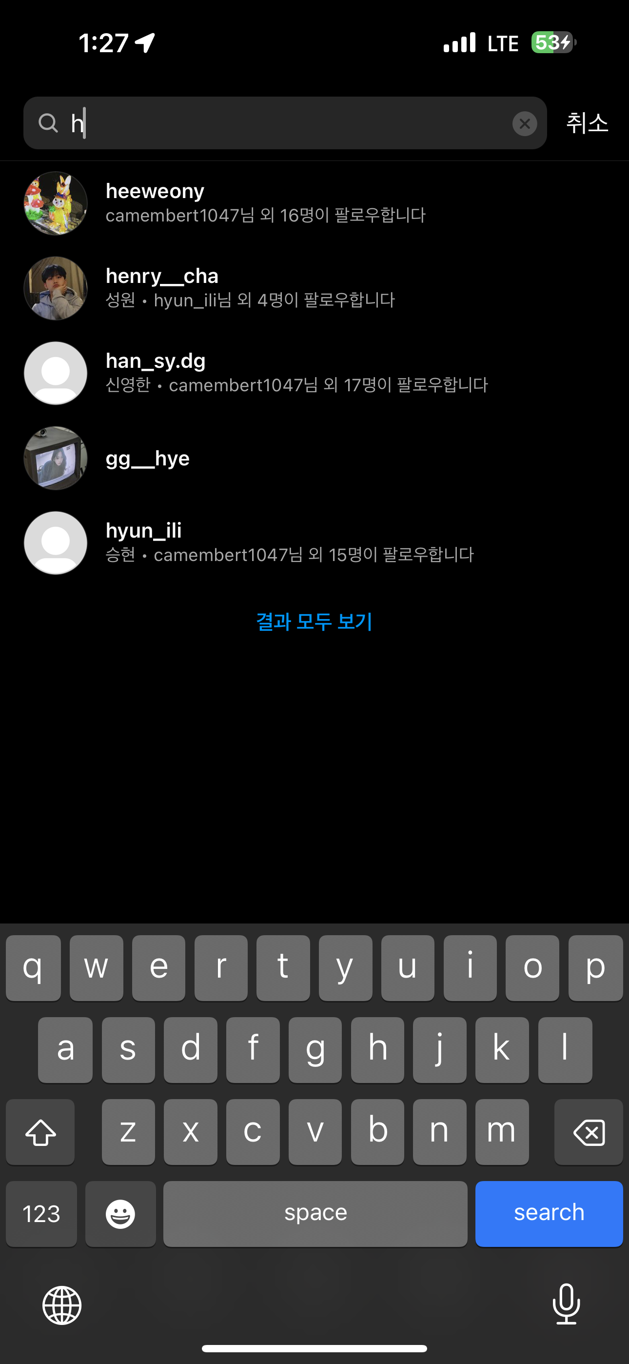위 이미지는 인스타그램에서 h라는 키워드로 검색을 했을 때의 결과입니다.