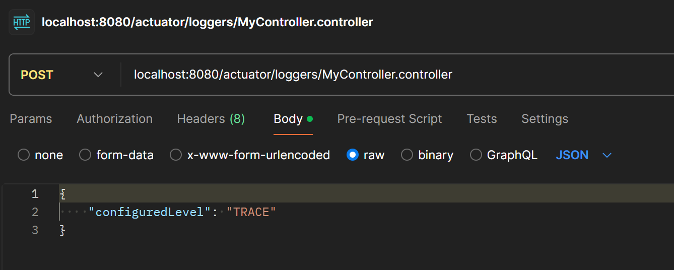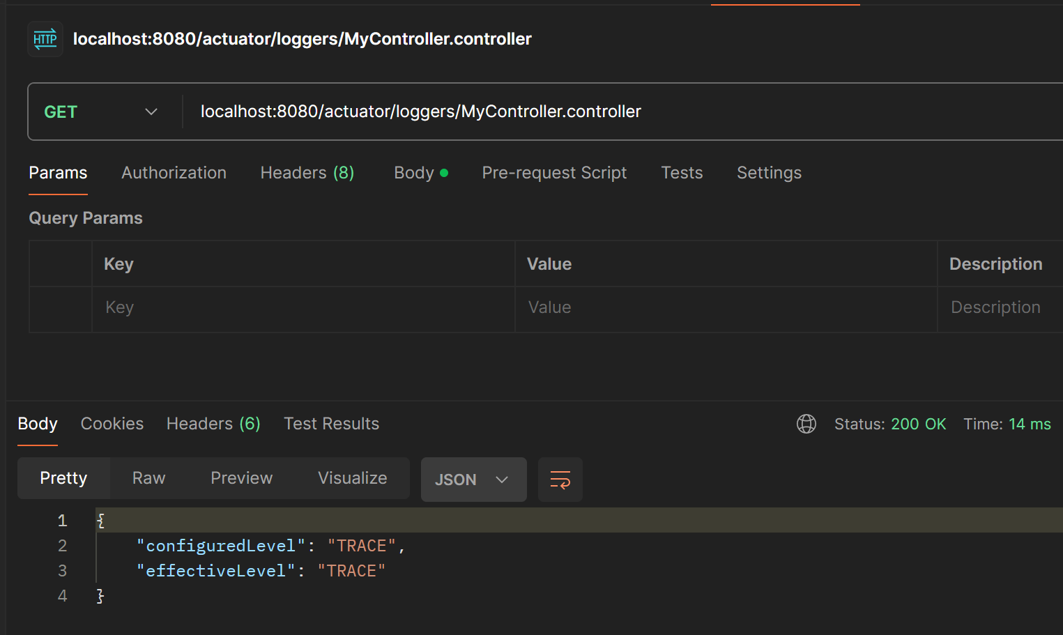 GET 요청을 통해 configuredLevel을 확인하면 변경된걸 확인할 수 있습니다.